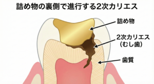 詰め物・被せ物が外れる理由の中でも最も多いのが、**むし歯の再発(2次カリエス)**です。治療後の歯と修復物の境目は、どうしても細菌が溜まりやすく、磨き残しが続くと再びむし歯が進行してしまいます。