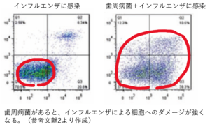 上の図は、歯周病菌がインフルエンザウイルスによる細胞へのダメージを強めることを示しています。