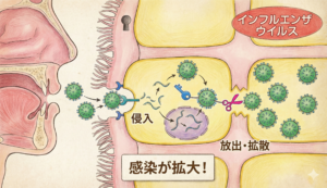 ウイルスは、のどや気道の粘膜に付着しただけでは増殖できません。