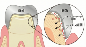 この状態が続くと、銀歯の下に侵入した細菌が活動しやすくなり、再発むし歯が進行しやすい環境が整ってしまいます。